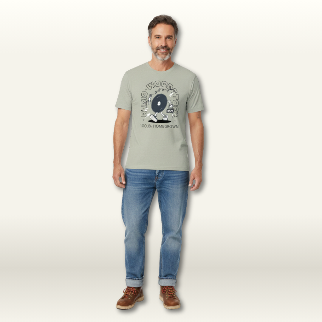 A soft hue for the dreamers. The Nostalgia Tee in “Thyme” brings comfort and vintage charm together with a relaxed, lived-in look that feels good from the first wear. The design features a playful, retro-style walking vinyl record character holding a cassette player, surrounded by musical notes and “Radio Woodstock” lettering—a nod to the station’s 100.1% homegrown roots and timeless connection to the music that moves the Hudson Valley.