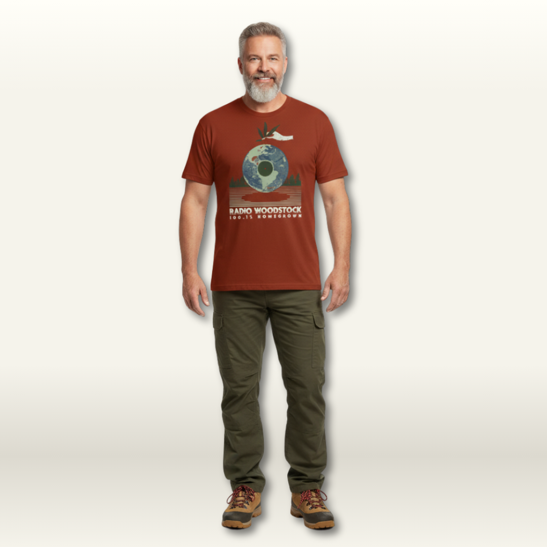 Bold and grounded like the music that moves us, the Woodstock to the World Tee “Rust” celebrates the enduring message of peace, art, and independence that defines Radio Woodstock. The design cleverly merges a vinyl record with a globe, visually representing "Woodstock to the World," while a hand gently plants a cannabis leaf atop the spinning earth-record, symbolizing the "100.1% Homegrown" spirit written below.
