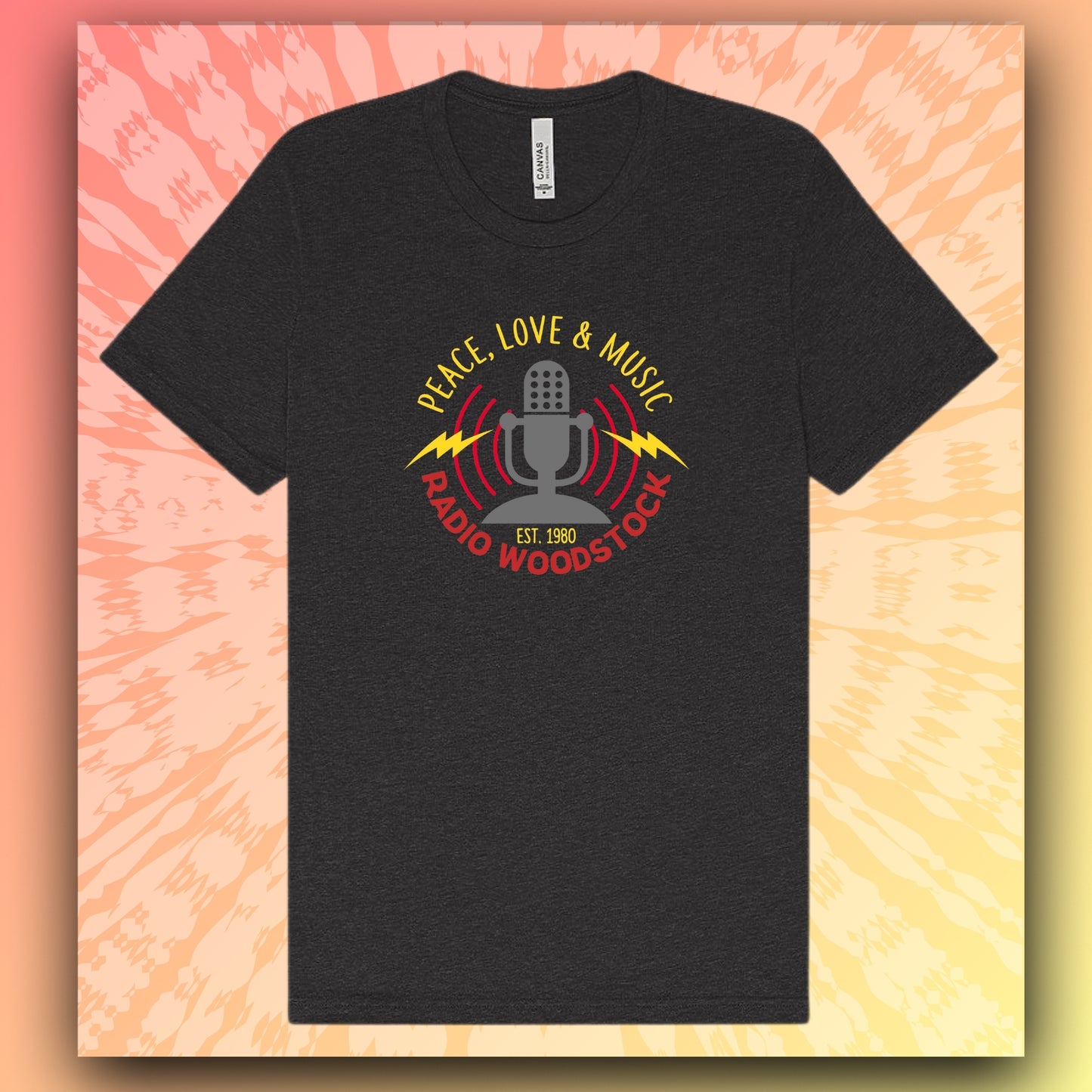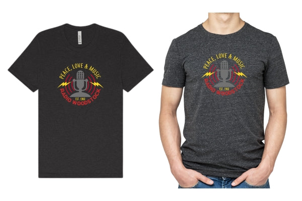 Radio Woodstock “Peace, Love, & Music Microphone" T-shirt on Bella & Canvas Heather Dark Gray ultra-soft fabric.
