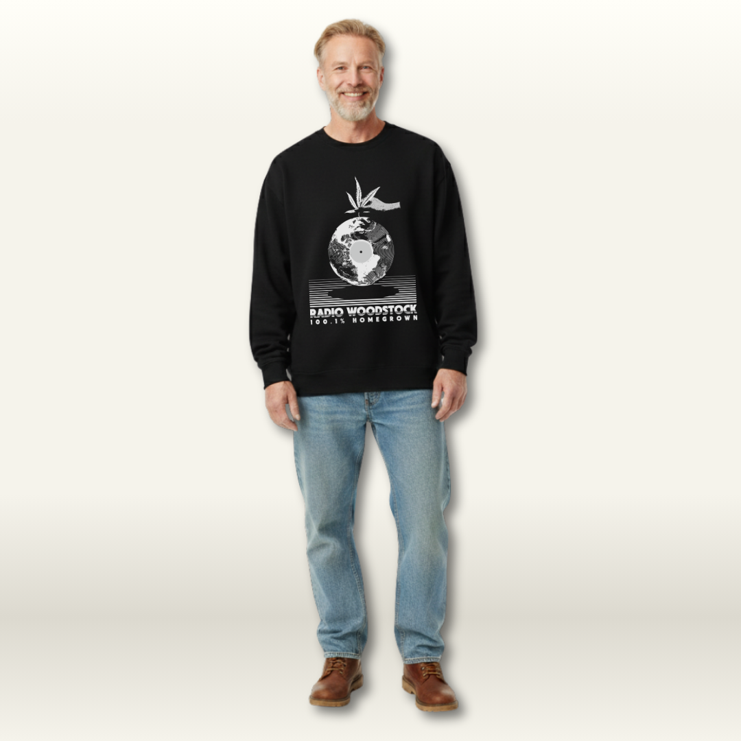 A modern classic made for cozy nights and crisp mornings. The Woodstock to the World Crewneck “Vintage Black” combines heavyweight warmth with a relaxed, boxy fit inspired by Y2K streetwear staples. The design cleverly merges a vinyl record with a globe, visually representing "Woodstock to the World," while a hand gently plants a cannabis leaf atop the spinning earth-record, symbolizing the "100.1% Homegrown" spirit written below.